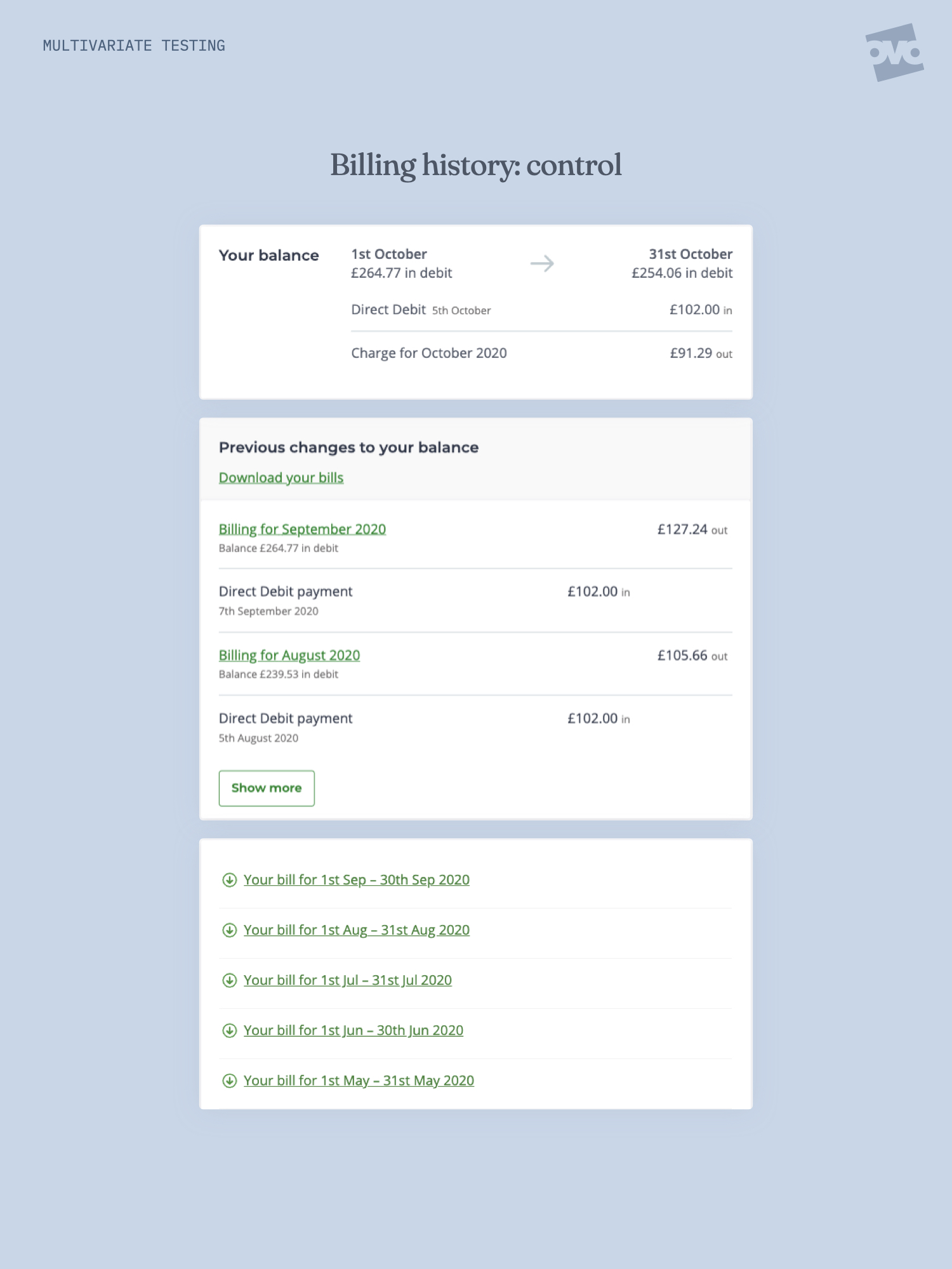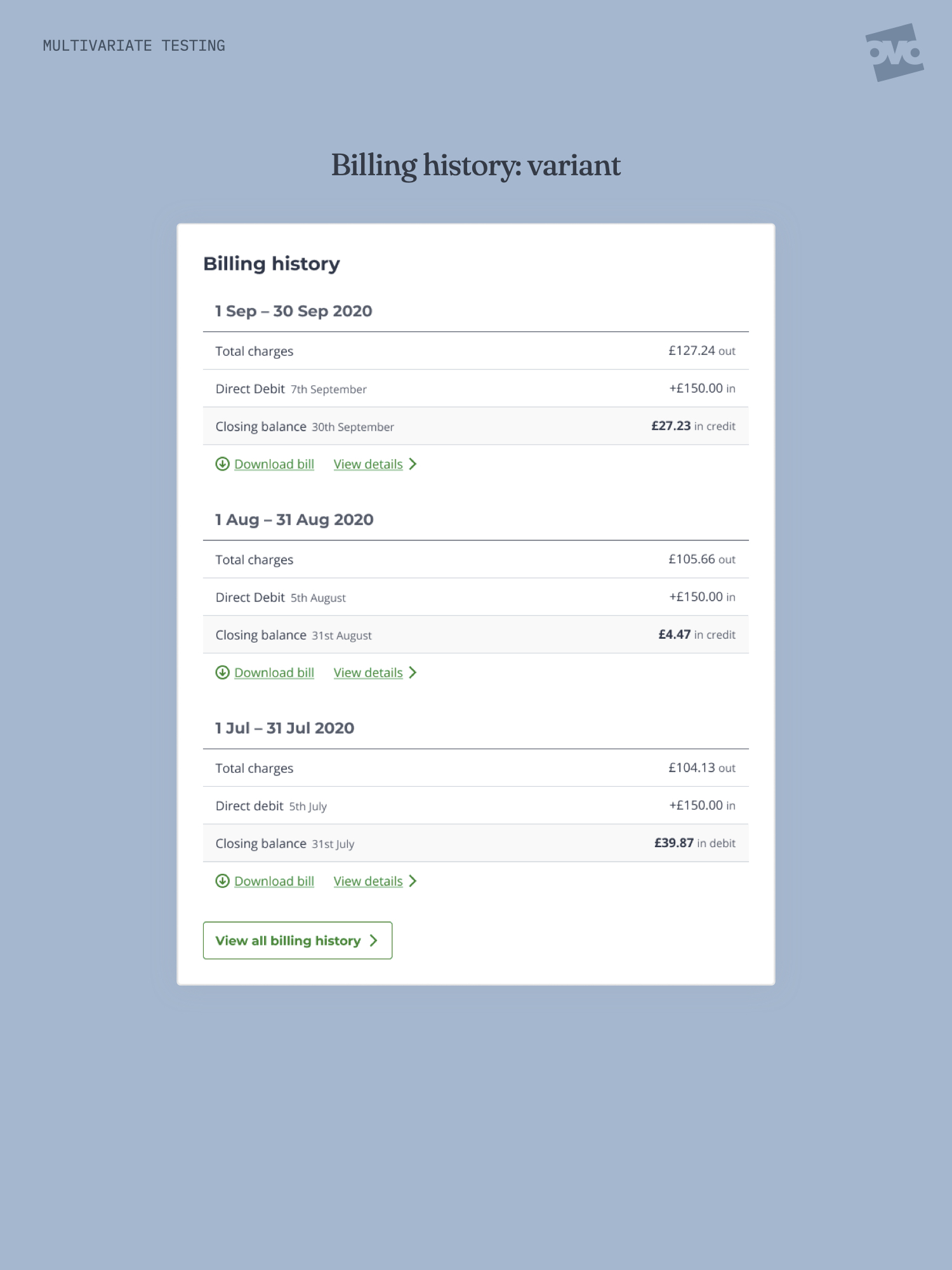 I led a one-week sprint to design and test an improved billing experience. We quickly built a prototype to test against the existing design, with decisive results: participants consistently failed basic tasks in the existing experience, often believing they’d completed steps when they hadn’t. Every task in the redesigned prototype was completed successfully. The redesign was built and rolled out immediately. The resulting boost in customer satisfaction meant migration could resume, with Orion becoming the default experience for 100% of OVO customers.